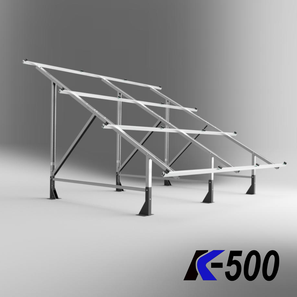 K502 beton: wolnostojąca konstrukcje dla 2 modułów w pionie z możliwością przytwierdzenia do podłoża betonowego. Idealne rozwiązanie dla instalacji gdzie niemożliwe jest standardowe wbicie konstrukcji ze względu na przebiegające w gruncie drogi kablowe, rury gazowe czy kanalizacyjne. Systemy przygotowane do montażu w stopach, wylewkach oraz płytach betonowych.